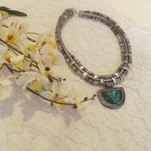 Colar com cordão de tecido sintético, com detalhes dourado e prata. Pingente prata velha com pedra sabão na cor verde.