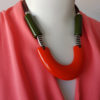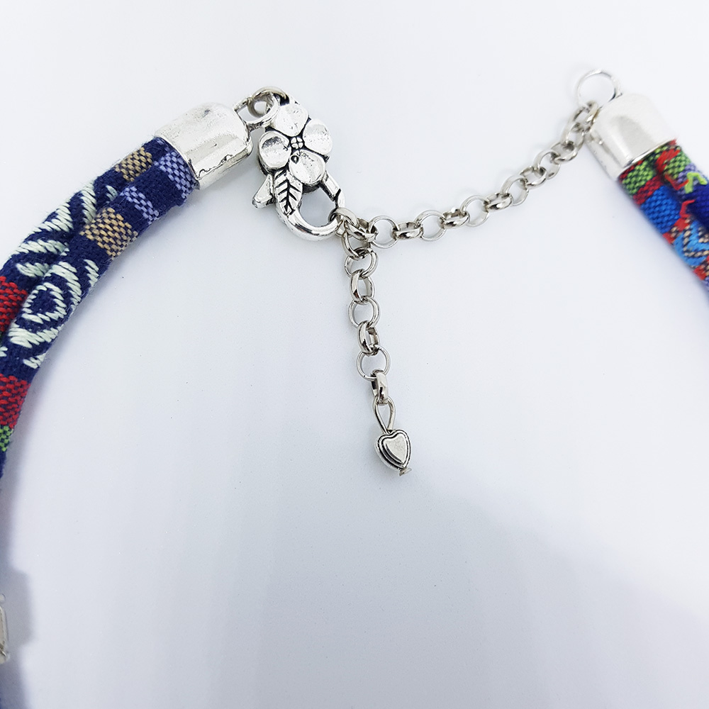 Muito estiloso esse colar de cordão de tecido étnico e medalha com sete círculos prateados sobrepostos. Delicado fecho de flor prateada.
