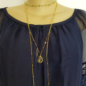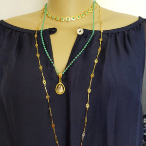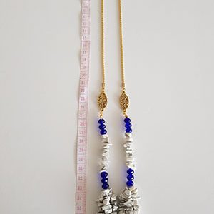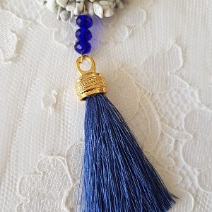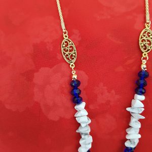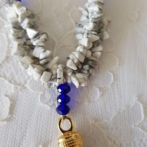 Cascalhos de howlita branca com cristais estilo Swarosviski compoe esse colar, com corrente branca e pingente de tassel azul.