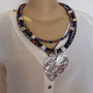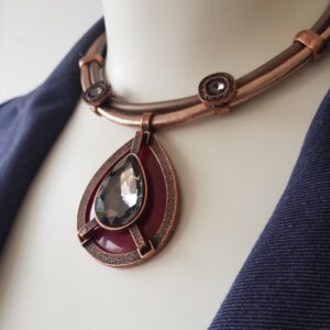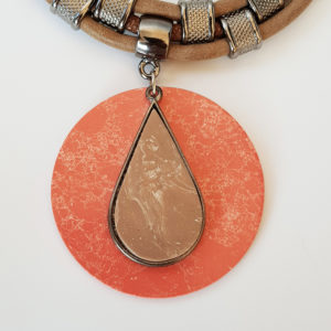 Colar com três cordões de couro sintético, pingente em pedra sabão reconstituída coral combinado com  uma  a pedra de formato de gota na cor  marrom claro. Os entremeios  são grafites com gancho imitando prata velha.