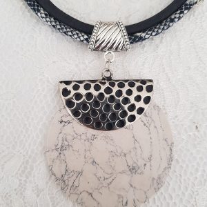 Colar de couro sintético com estampa de cobra, combinada com couro preto. Sofisticada medalha confeccionada em pedra sabão branca com entremeios de prata antiga.