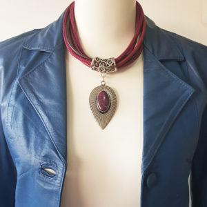 Moderno e elegante! Colar de couro sintético em vários tons de vinho combinado com cordão maritinho do mesmo tom. Pingente prateada.