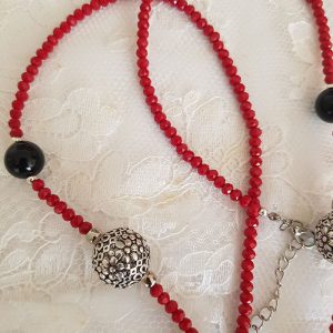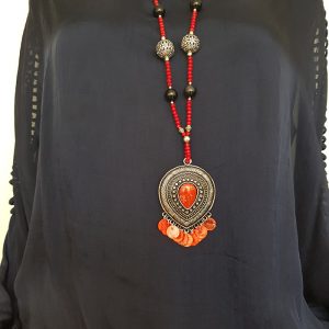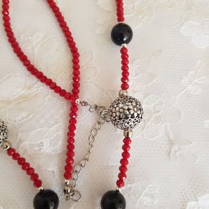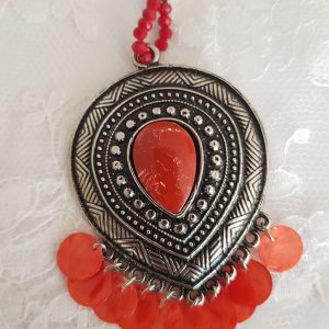 Colar de contas cristais vermelho, com medalha em prata antiga com pedra sabão vermelha. Além dos cristais, possui 4 pedras obsidianas naturais preta e 2 contas de prata tibetana. A medalha possui um pedra sabão vermelha no centro e madrepérolas também na cor vermelha formam lindos pingentes.