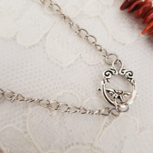O colar fechado mede 36cm de comprimento, com fecho e corrente em prata velha.