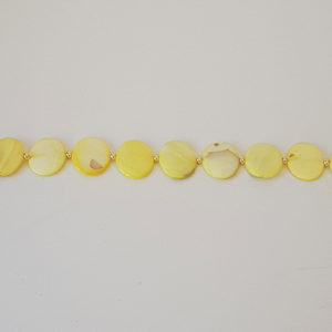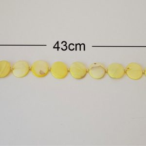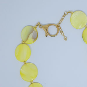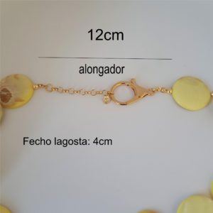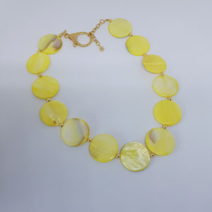 Peças em madrepérola nunca saem da moda.  A cor amarela é resultado de tingimento artificial, mas continua valorizando a pedra. Lindíssimo o colar de madrepérola com entremeios de hamatita dourada compõem um visual clássico e elegante.
