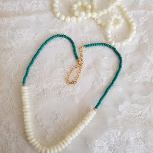 Madréperola oval compõe esse lindo colar combinado com contas verdes.