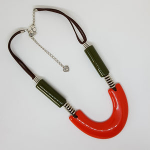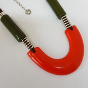 Moderno colar de resina laranja com cordão de couro marrom escuro com acabamentos preteados.