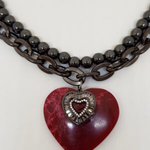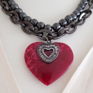 Corrente grafite combinado com pedras de hematite 8mm e lindo coração de pedra sabão vermelha e minicoração de zirconia.