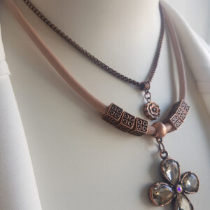 Delicada gargantilha com duas camadas, a de couro rosê tem seis berloques cobres e pingente com trevo de 4 folhas e chaton cristal.
