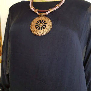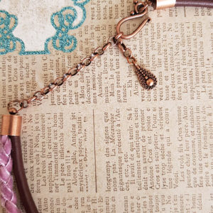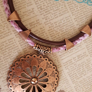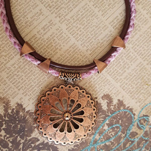 Maxcolar de couro sintético vinho combinando com tecido de camurça lilás, para dar mais sofisticação na peça, uma linda medalha em cobre. Fecho e entremeio bronzes.