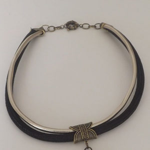 Colar de couro sintético, couro duplo dourado e preto, com medalha em pedra sabão. Pingente e entremeio de ouro velho.