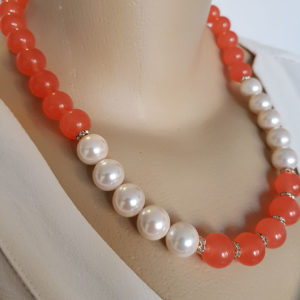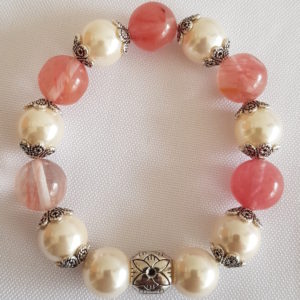 Pulseira de pérola shell e red cristal, com detalhes em prata velha.